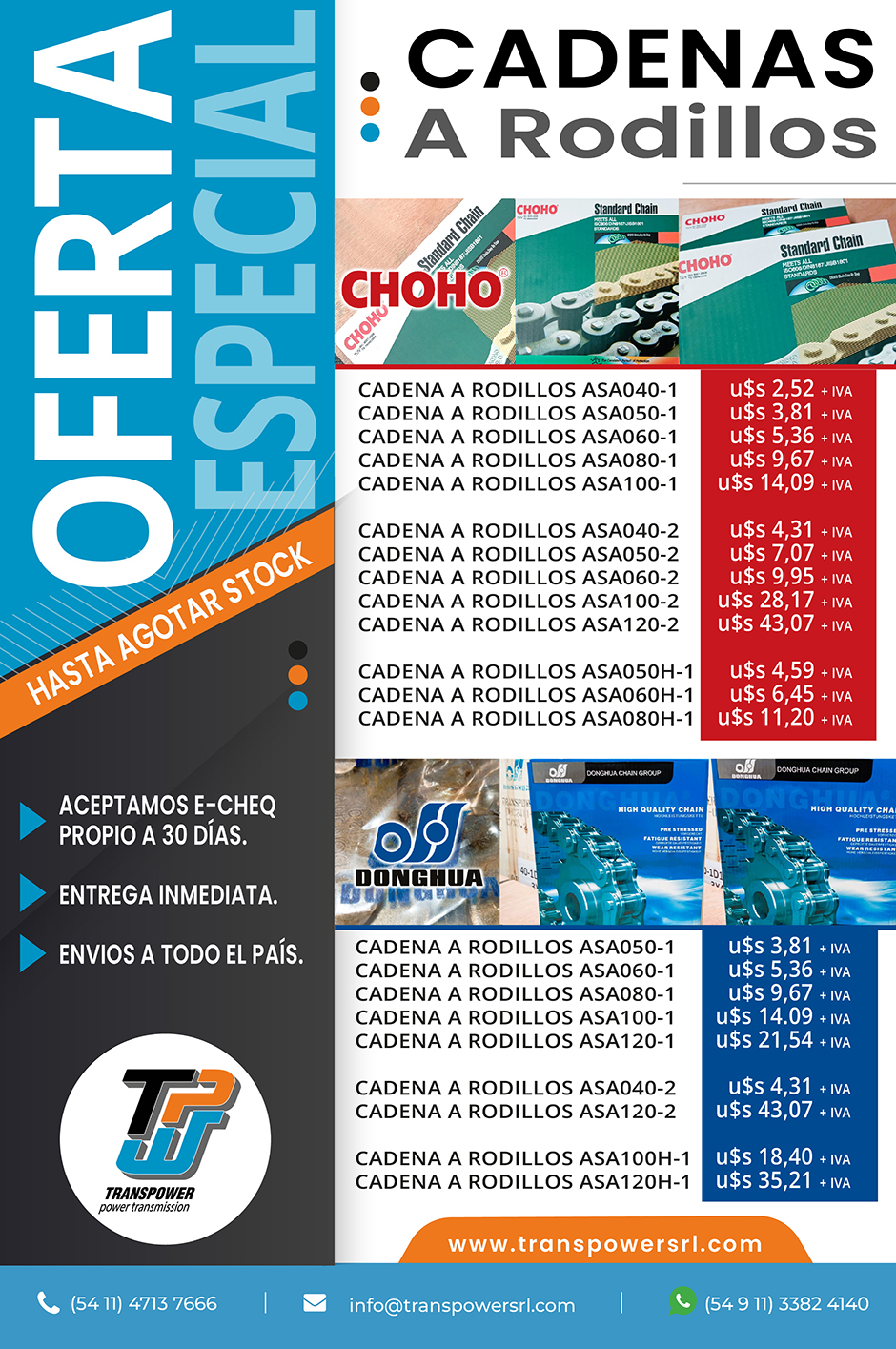 Como parte de su política comercial, TRANSPOWER SRL ofrece condiciones competitivas para su línea de cadenas a rodillo CHOHO y DONGHUA: